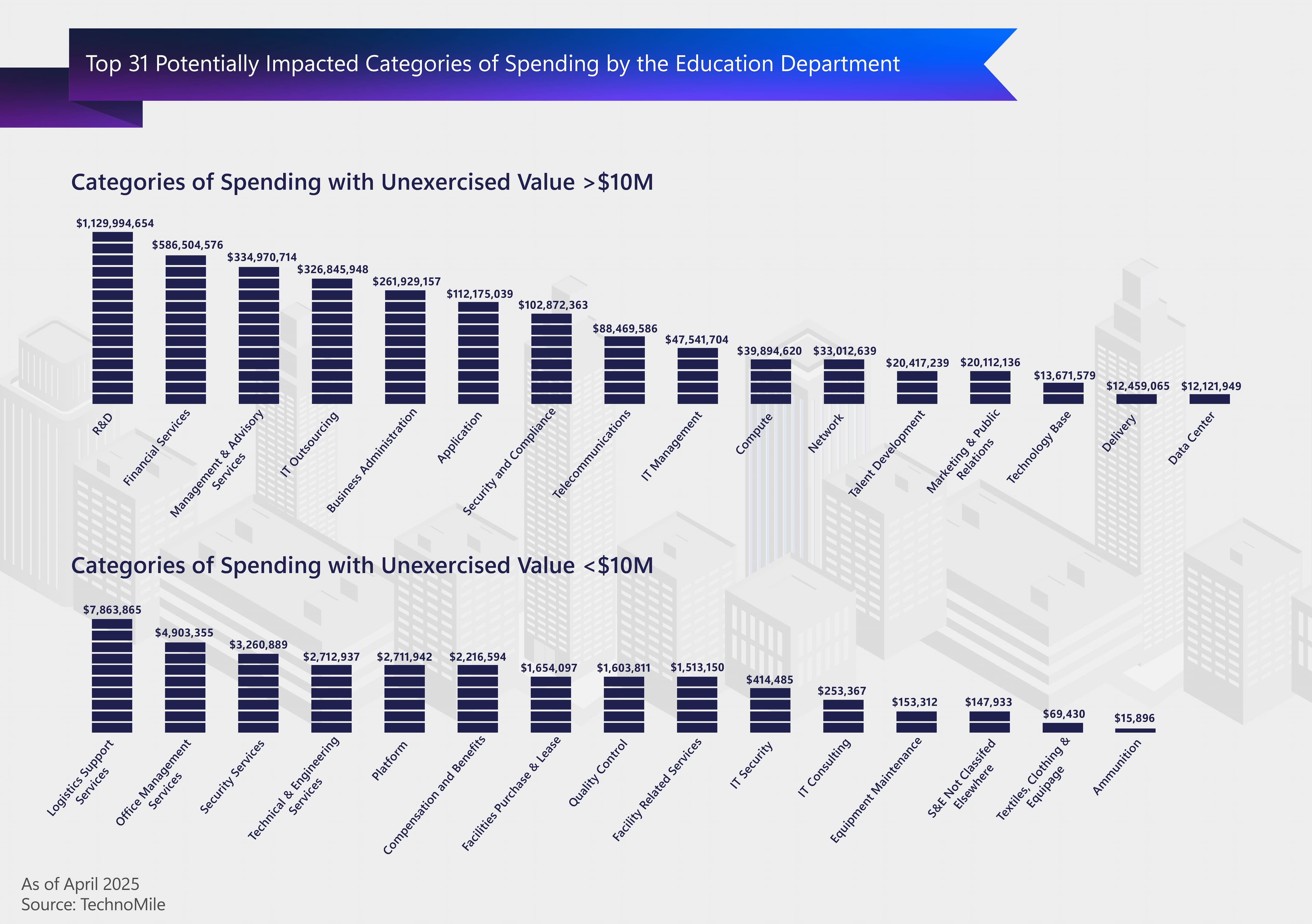 The image above visualizes the at-risk contract value across the top 31 categories of spending by the Department of Education among the 180+ impacted vendors. The top three categories comprise 65% of the total $3.2B in unexercised ceiling + options value. These categories include: